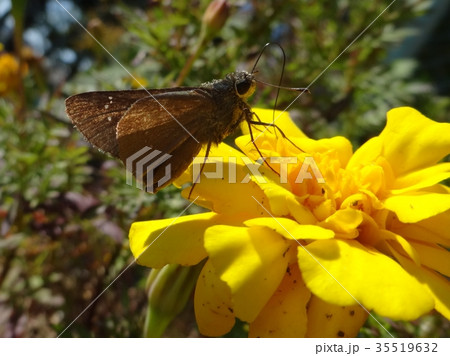マリーゴールドの蜜を吸うチャバネセセリ蝶