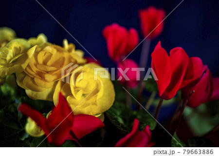 突然夏に花を咲かせたシクラメンと黄色いベゴニアの花のクローズアップ