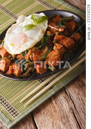 Thai chicken with basil and egg close-up