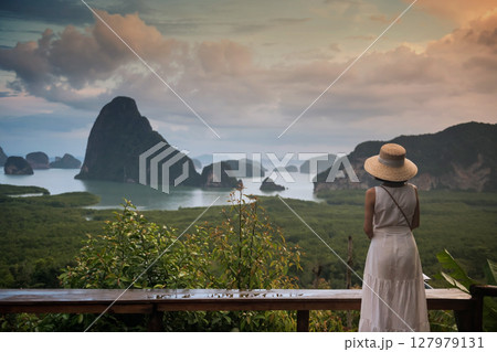 woman enjoy Phang Nga Bay from Samed Nangshe viewpoint at sunrise