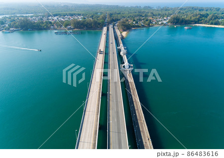 Aerial view of Sarasin bridge road transportation background concept The bridge is a between Phang Nga and Phuket island Thailand The bridge is the most important in making business and transportation
