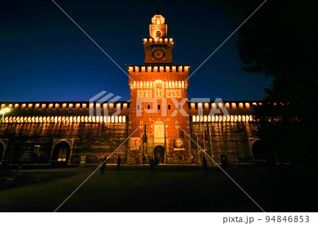 ミラノ ライトアップされたスフォルツェスコ城