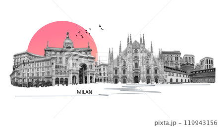 Photo collage from Milan, Italy. Collage includes major landmarks like the castle, cathedral. Art design