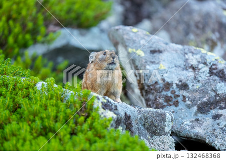 植物の緑あるガレばで瞑想するエゾナキウサギ