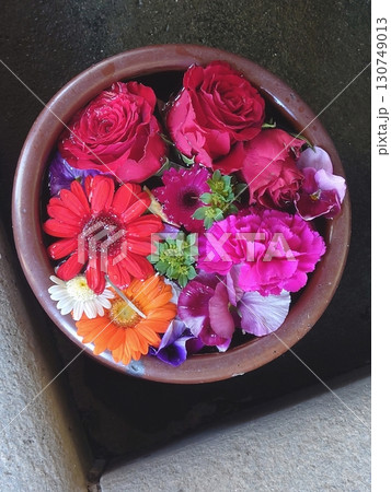 Bouquet of flowers in vase 赤色系のフラワーアレンジメント(花の手水鉢)