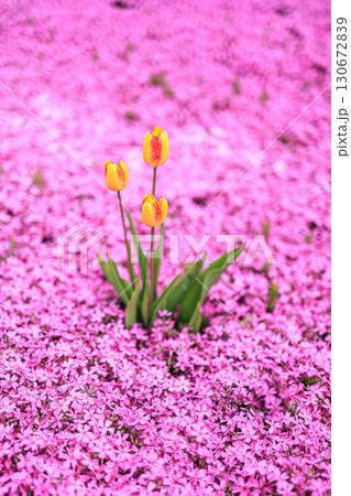 ピンクの絨毯に映える黄色と赤のチューリップ