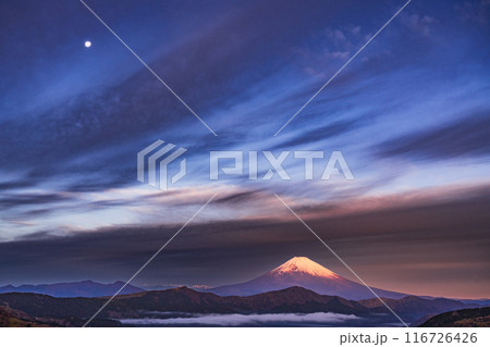 (神奈川県)箱根大観山から望む、満月と富士山 夜明け