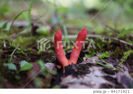 小指の先ほどの大きさの猛毒の赤いキノコ「カエンタケ」(マクロレンズ使用・屋外自然光・接写写真)