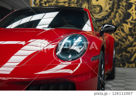 Close up of the red 2025 Porsche 911 GT3 922 front end, focusing on the left LED headlight. A gold and black mural and checkered floor are visible indoors.