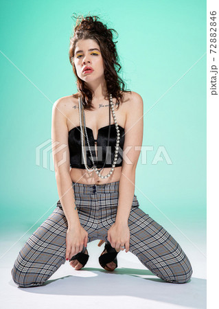 girl in a blue shirt bright makeup glasses student emotions model fun