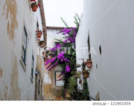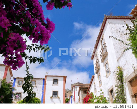 観光地 オビドスの街角と美しいブーゲンビリア(ポルトガル)