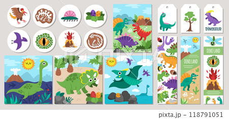Cute dinosaur cards set with Pterodactyl, Stegosaurus, Tyrannosaurus, Triceratops, T-Rex. Vector cartoon prehistoric square, round, vertical print templates, tags, postcards, ads
