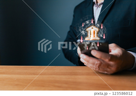 Economic and financial analysis, interest rates. Percentage model, red arrow go down. Federal Reserve bank interest rate reduction concept.