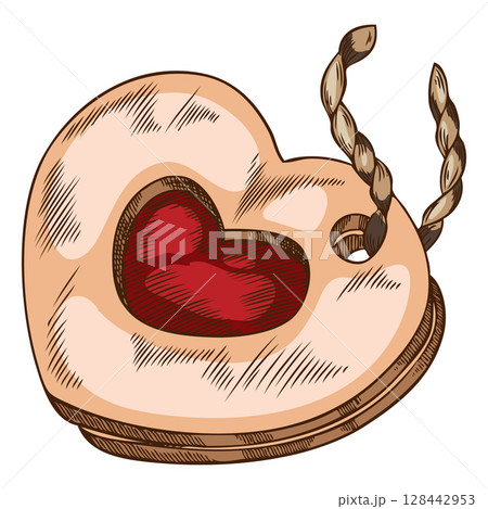 Wooden tag on a rope heart shape vector sketch icon, promo or gift decoration, hand drawn design craft decorative label