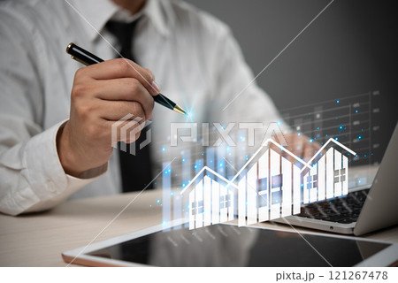 Real estate concept business, home insurance and real estate protection. Buy and sell houses and real estate online on a virtual screen
