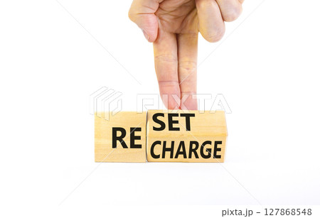 Reset and recharge symbol. Concept words Reset Recharge on beautiful wooden block. Beautiful white table white background. Businessman hand. Business reset and recharge concept. Copy space.