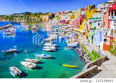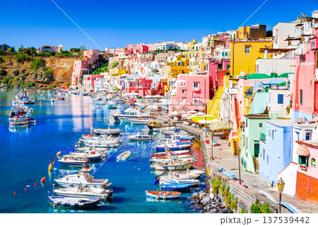 Procida in sunny summer day. Colorful houses, cafes and restaurants, fishing boats and yachts in Marina Corricella, blue sky and azure sea, Procida Island, Italy.