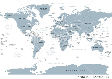 Pacific centered world map. Gray political map, placing Pacific Ocean at the center, showcasing Asia, Oceania, and the Americas around it, emphasizing the Pacific Rim. Cylindrical projection. Vector