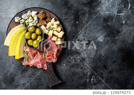 Meat cheese platter antipasti snack with Prosciutto ham, Parmesan, Blue cheese, Melon and Olives on wooden board. Black background. Top view. Copy space