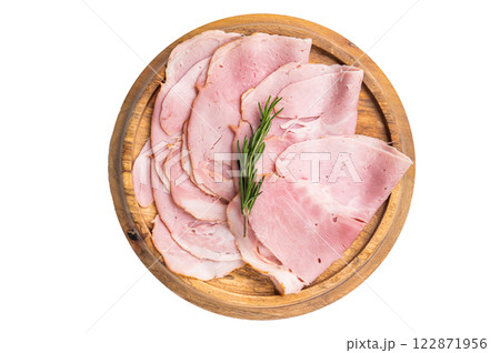 Prosciutto Cotto, Sliced Pork Ham on wooden board. white background. top view