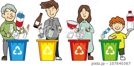 ゴミを分別して出す人々のかわいいイラスト