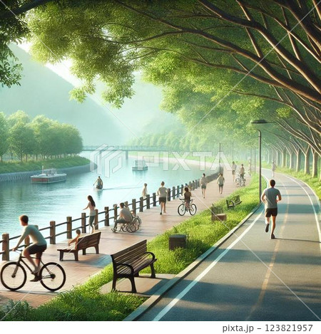 朝の川沿いで運動する人々