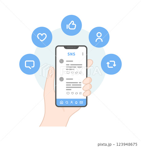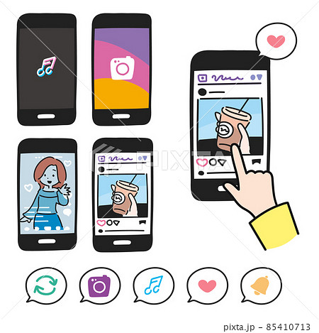 スマホ画面とSNSの反応イラスト いいね・フォロー・シェア・コメント・リポスト
