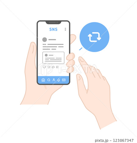 スマホでSNSの投稿をフォロー・リポストするイラスト図解(線画・カラー)