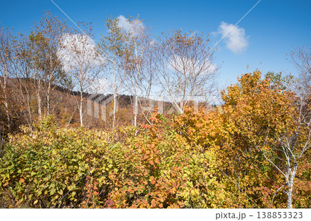 青空の下の白布峠の山形県側の紅葉