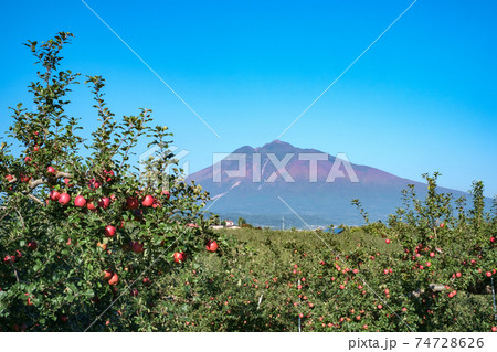 秋晴れの岩木山と真っ赤に実った林檎の果実