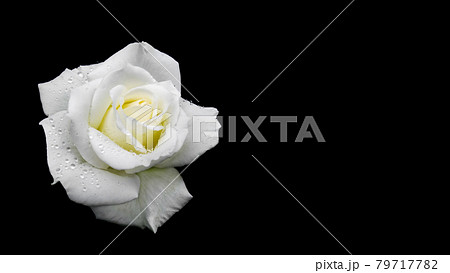 Beautiful white rose with dew drops isolated on black background. Ideal for greeting cards for wedding, birthday, Valentine's Day, Mother's Day. 16x9