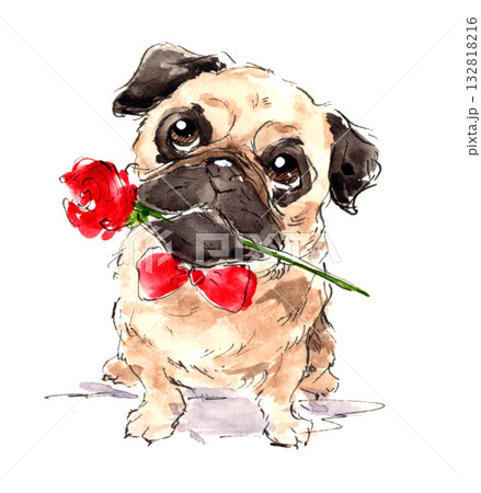赤いバラをくわえたパグのかわいい水彩イラスト