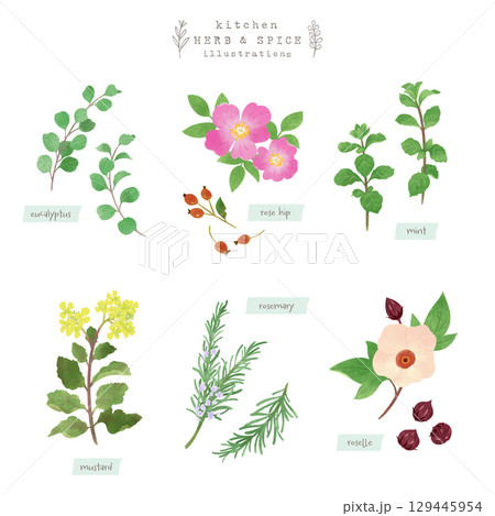 キッチンハーブとスパイスの水彩イラスト-5(背景 紺)
