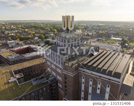 Dortmund U-Tower in Evening, Aerial Drone Shot. City skyline on the background in sunny day.