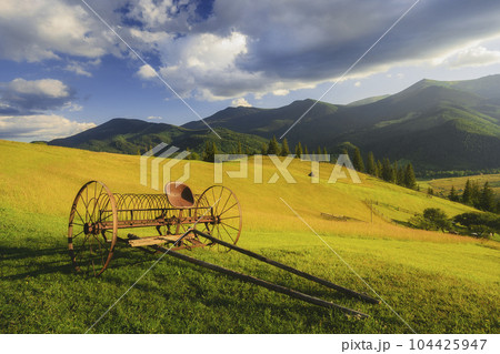 Ukraine, Ivano Frankivsk region, Verkhovyna district, Dzembronya village, Old farm machine in rural landscape in Carpathian Mountains