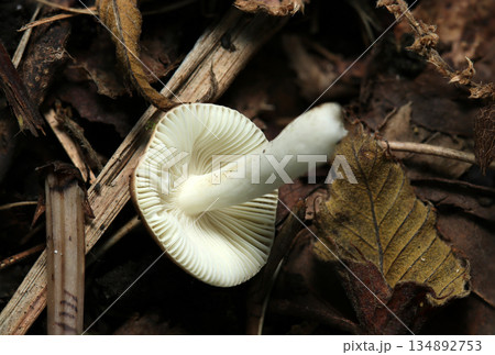 白いベンタケ属シロハツモドキキノコのカサ・ヒダ・断面(自然下菌キノコ類マクロ撮影)