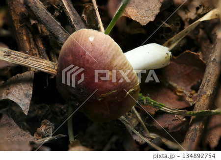湿潤な森の土壌から抜いたベニタケ属茸の全体象(自然環境下ストロボマクロ撮影)