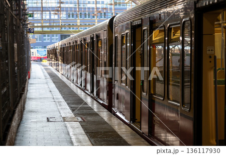 Berlin, germany, august 11, 2023. S-bahn train waits at a berlin platform with another train in the distance, urban transit scene highlighting modern rail infrastructure