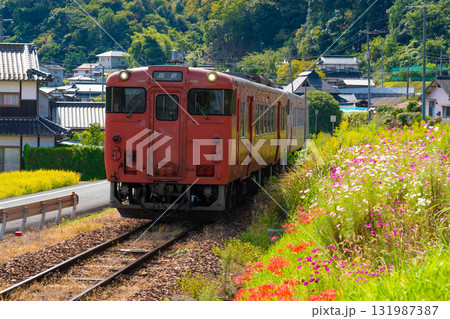 秋の花咲く津山線を走る津山駅行き観光列車・SAKU美SAKU楽5 岡山県岡山市北区