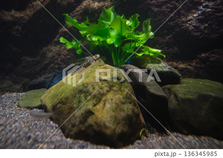 高知県 水族館の水槽の中で岩陰に隠れているつもりのクロヨシノボリはハゼのグループ