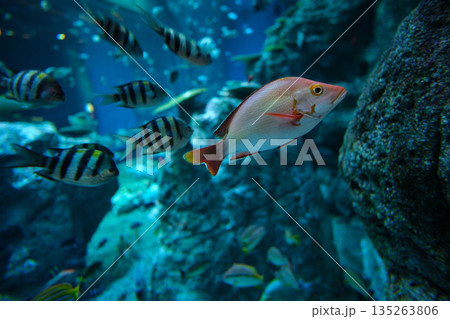 高知県 水族館の水槽の中で熱帯魚たちと一緒に泳ぐヒメフエダイ
