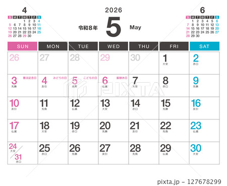 2026年 カレンダー 5月 令和8年 祝日・六曜