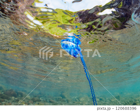 水面を漂う美しいけど猛毒の触手を持つカツオノエボシ(カツオノエボシ科)の半水面撮影。伊豆中木ヒリゾ浜