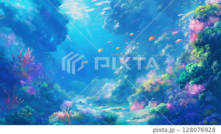 美しい光がさす海中の珊瑚礁の風景、アニメ風