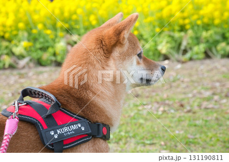 黄色い花と柴犬の優雅な横顔 / Shiba Inu with Yellow Flowers
