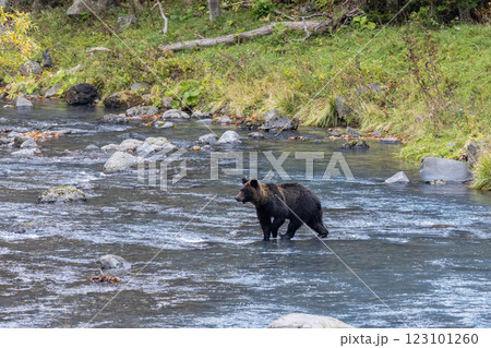 北海道知床半島の川を鮭をくわえて歩くヒグマ