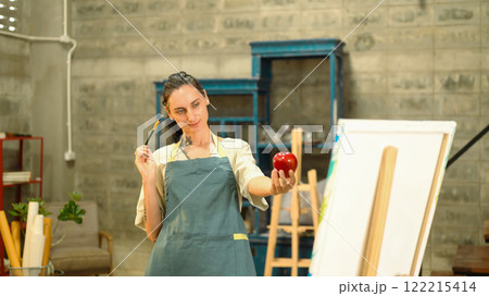 Thoughtful artist observing a red apple, preparing to sketch still life object creative studio