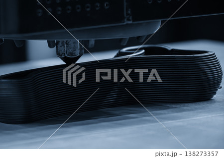 An object printed on a 3D printer from hardened rubber close-up. Model black color created on a 3D printer from hardened rubber under influence of ultraviolet light. SLA 3D printing. Stereolithography