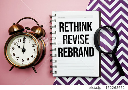 Rethink Revise Rebrand text written on notepad with alarm clock