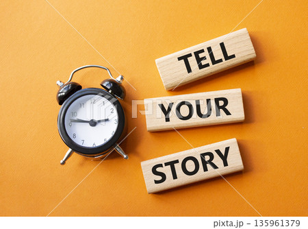 Tell your story symbol. Wooden blocks with words Tell your story. Beautiful orange background with alarm clock. Business and Tell your story concept. Copy space.